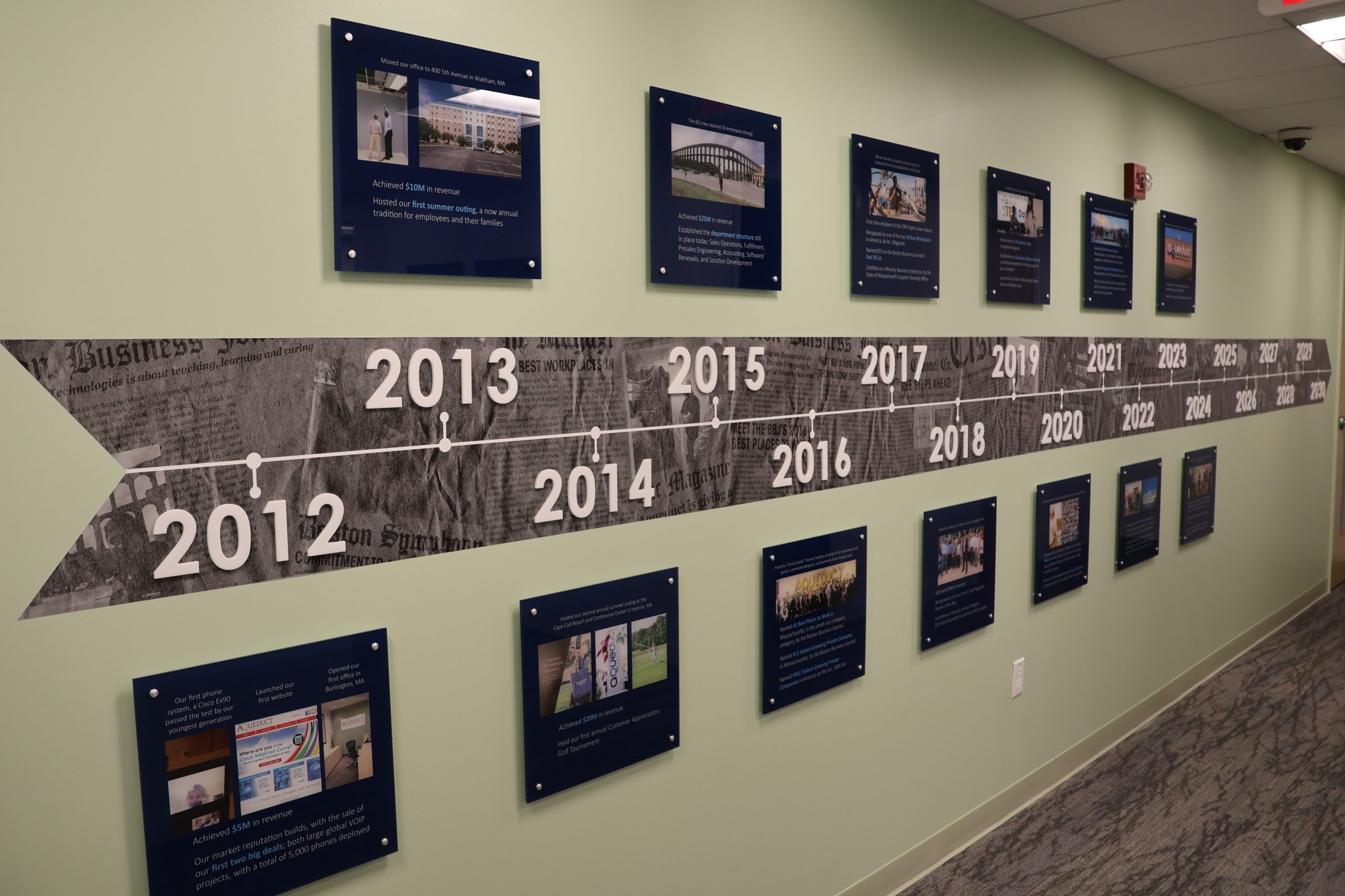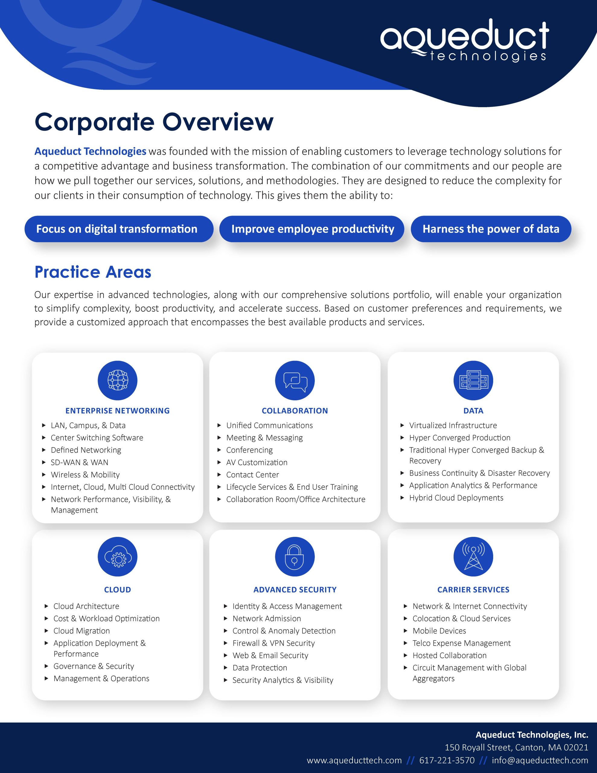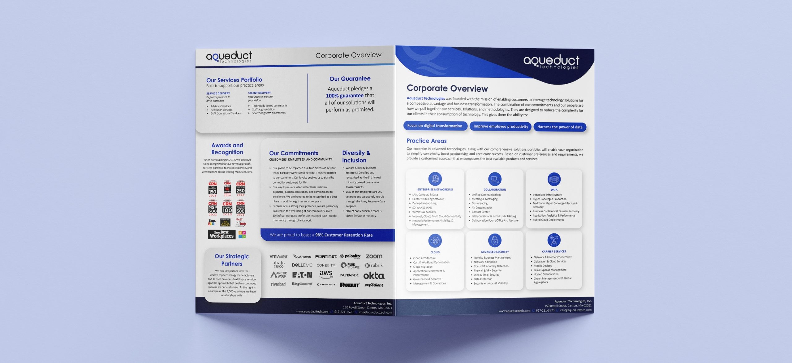 Corporate overview I designed for Aqueduct Technologies, a New England B2B tech company. I also designed a timeline, which is installed in Aqueduct’s office, showing the company’s growth over the years.