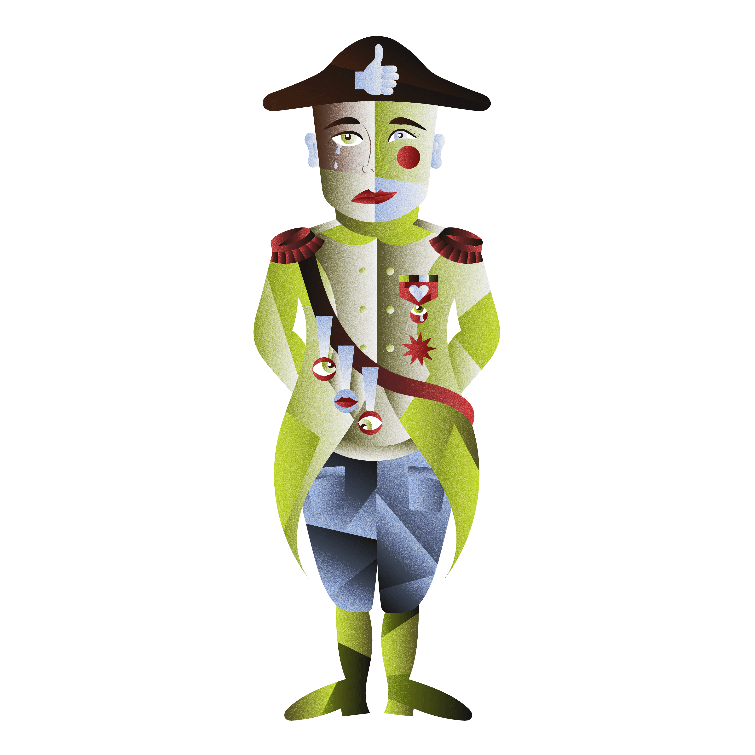 I went to Oberlin College and spent four years dining in a massive 100+ person co-op. We made decisions by consensus, which sometimes involved discussion leaders gauging the “general feelings” of the co-op on an issue with a show of thumbs. We would joke about who this elusive General Feelings might be, and why an esteemed general was so emotional. I was commissioned to draw the General himself, so here he is in all his emotional glory.