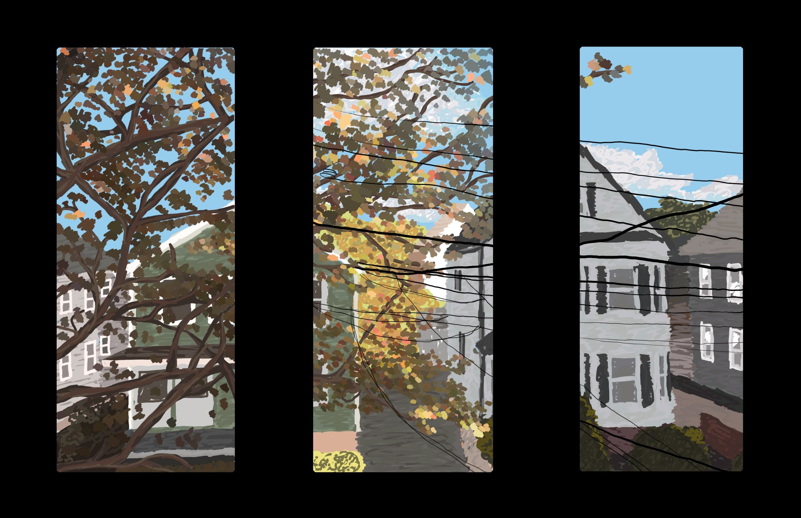 Digital painting of the view out my old bedroom window. I made this for my dad so that even though we live far away from each other, he could look at what I was looking at, and it was a little bit more like we were together.