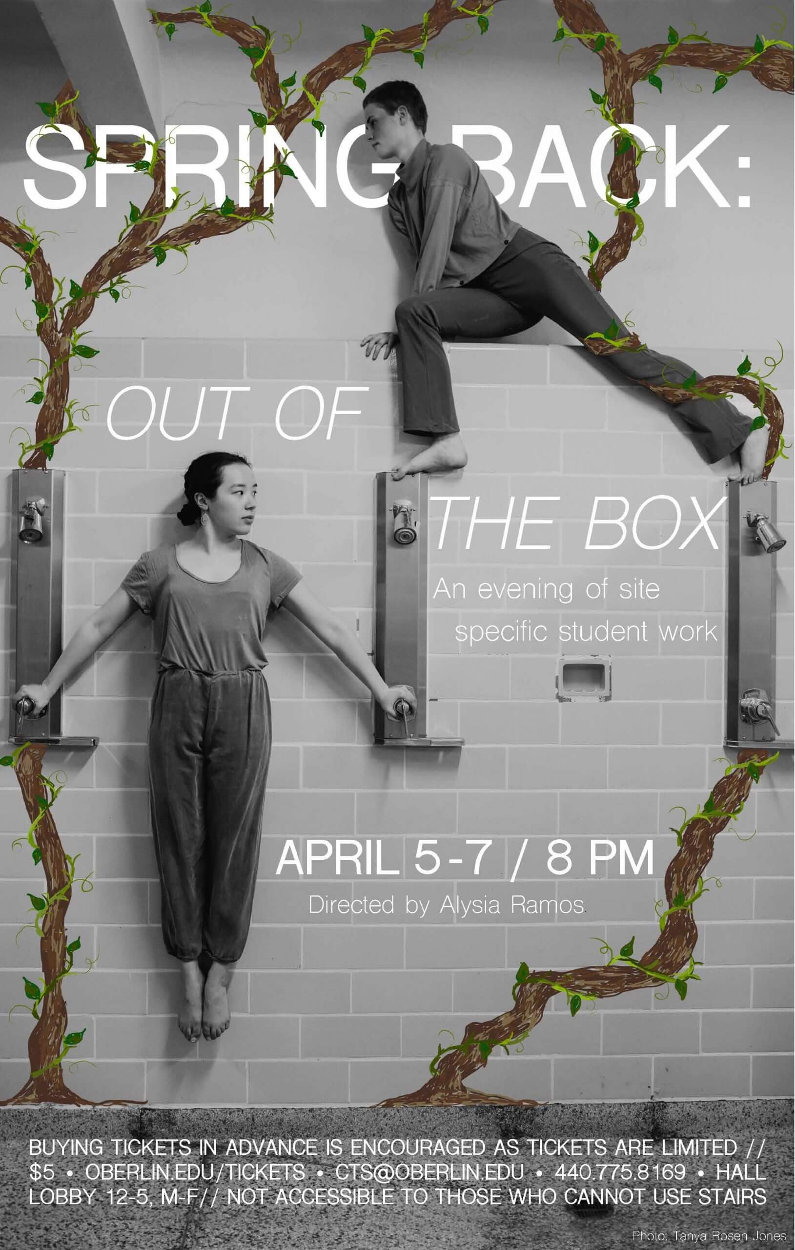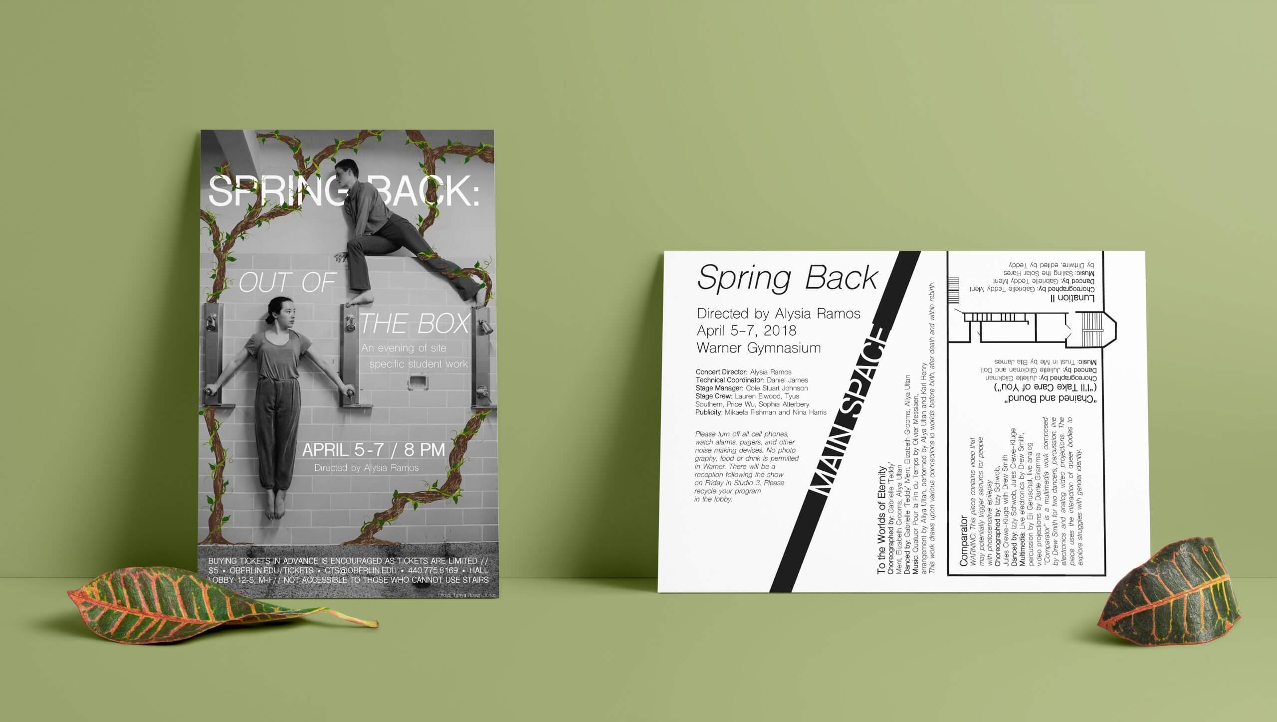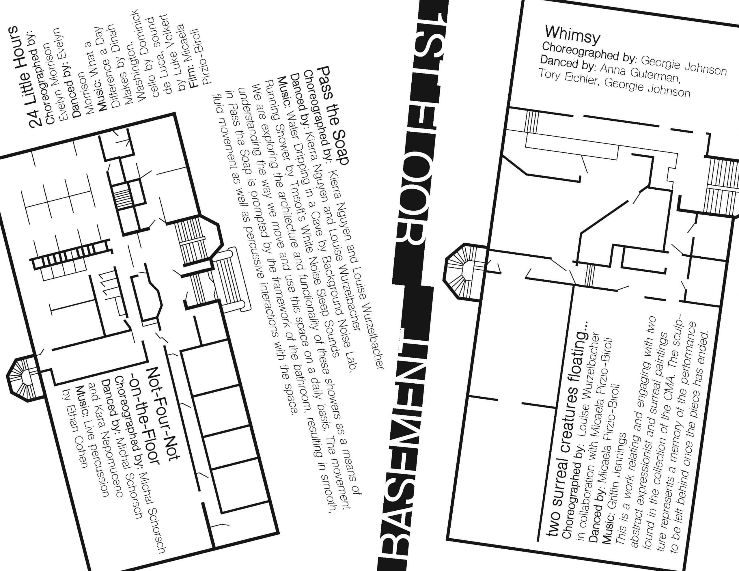 Poster and program for Oberlin College’s spring dance performance. This was a site-specific performance in which the audience moved from room to room in the dance building and watched performances that were designed for each room. Because the audience had to navigate around the building, I laid out the program within a blueprint of the building so that it served as both a map and a description of each dance piece.